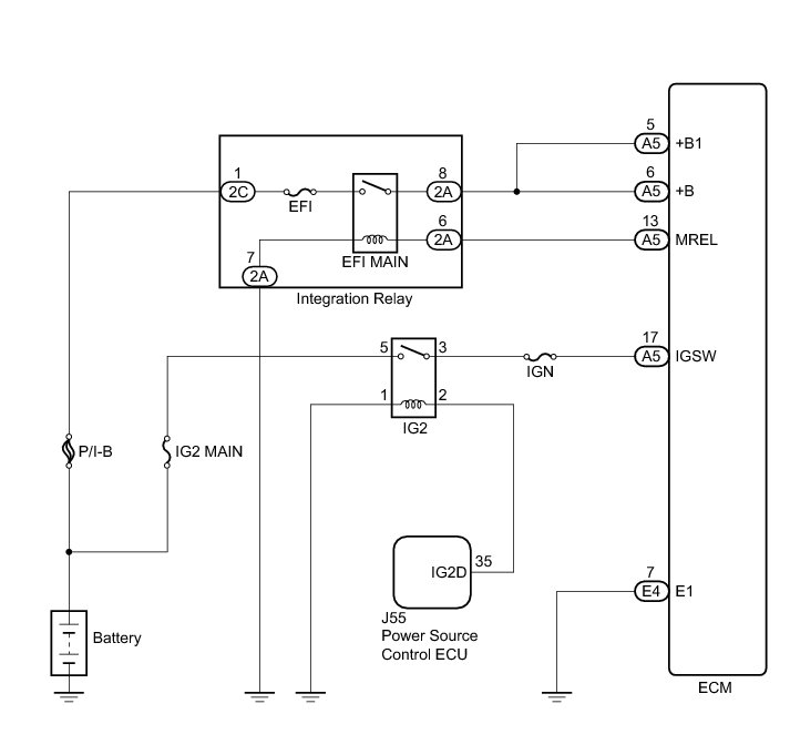 When the engine switch is turned on (IG), voltage from the ECM's MREL terminal is applied to the integration relay (EFI MAIN relay). This causes the contacts of the integration relay (EFI MAIN relay) to close, which supplies power to terminal +B and +B1 of the ECM.