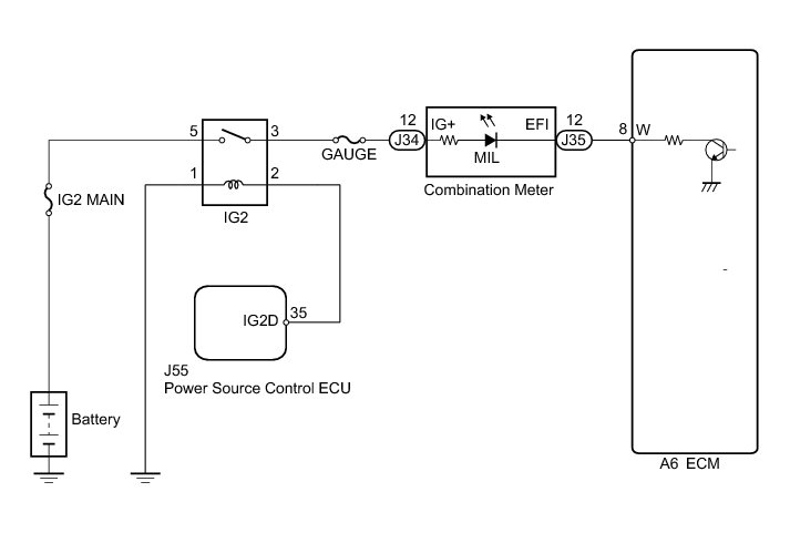 The Malfunction Indicator Lamp (MIL) is used to indicate vehicle malfunctions detected by the ECM. By turning the engine switch on (IG), power is supplied to the MIL circuit, and the ECM provides the circuit ground which illuminates the MIL.