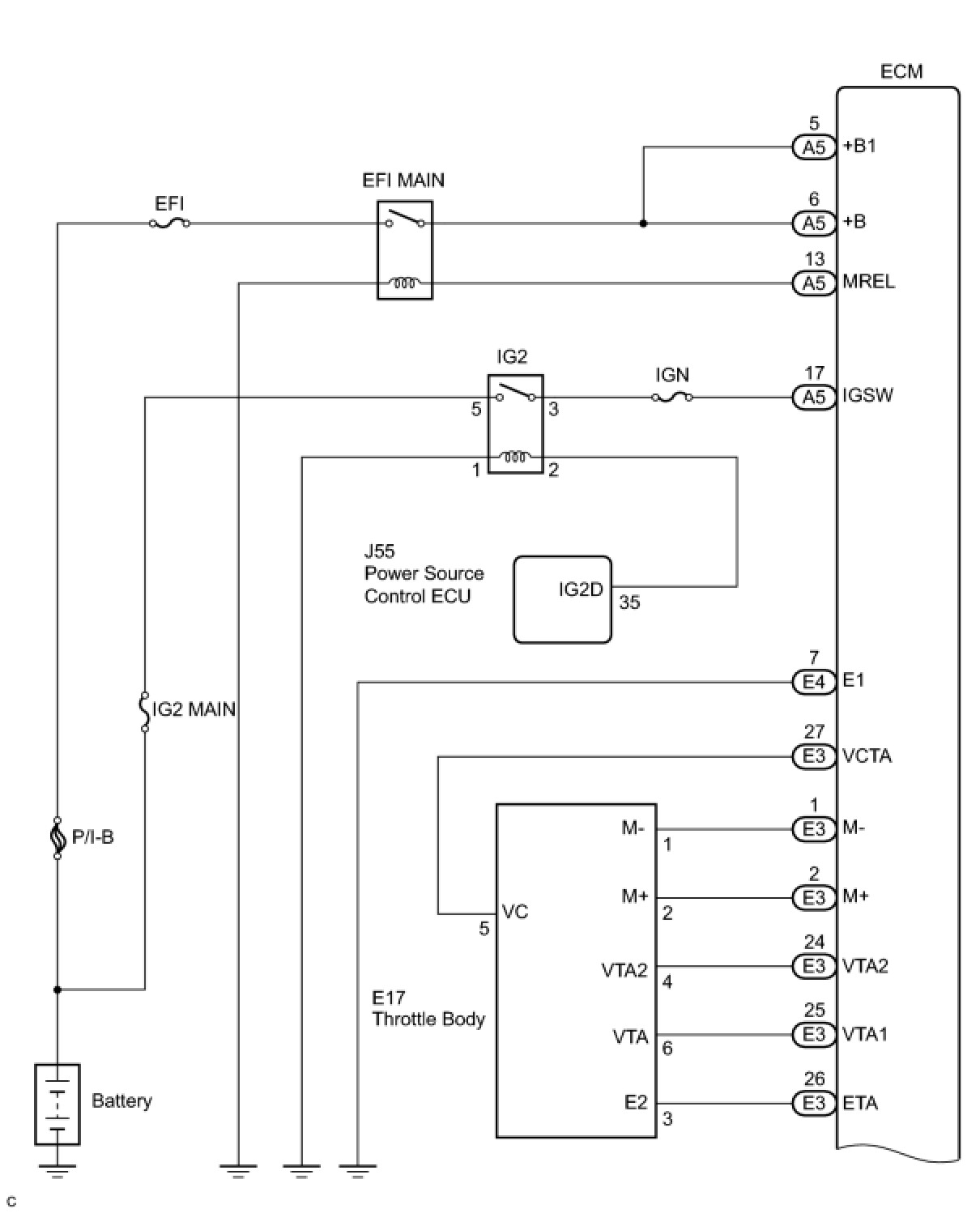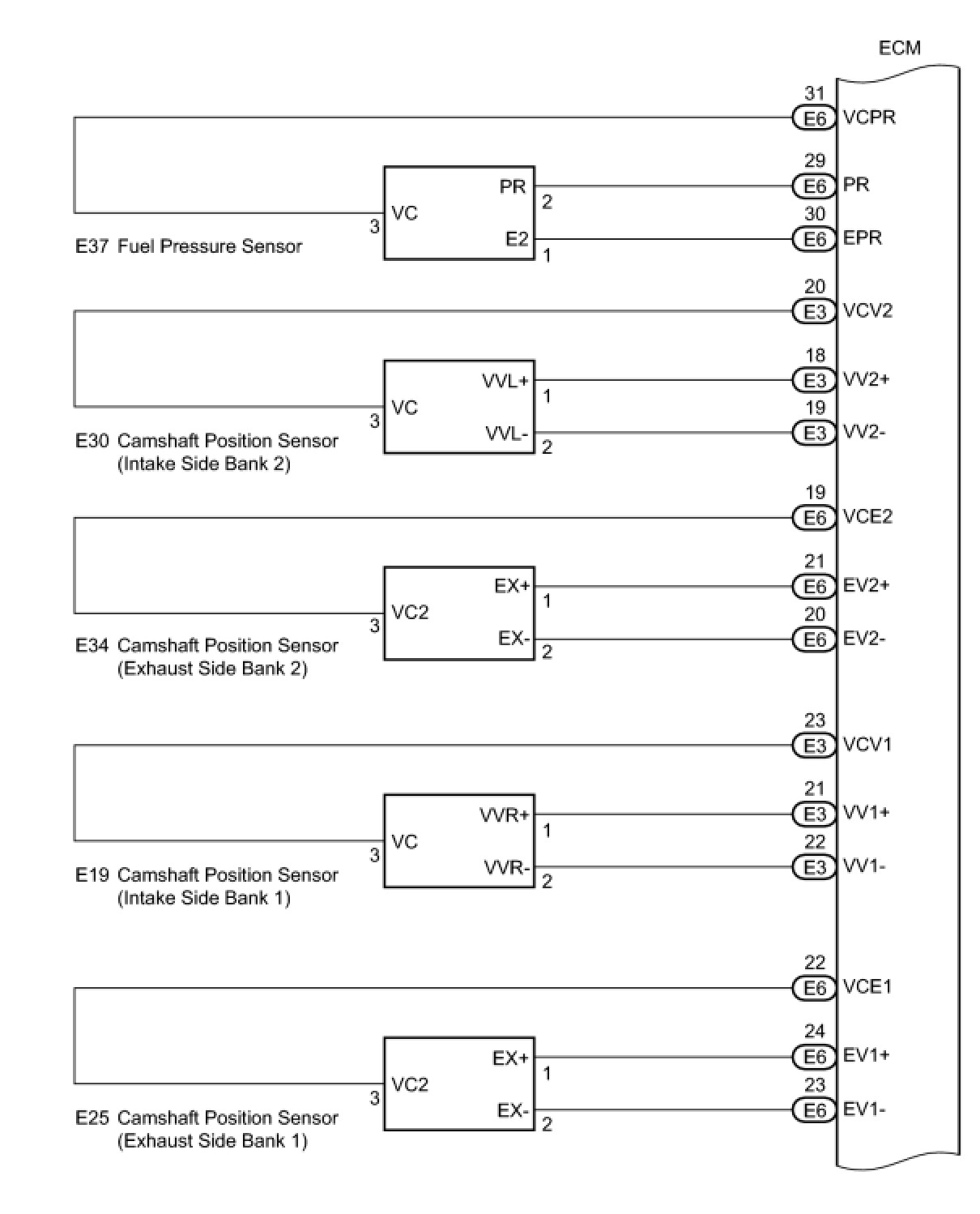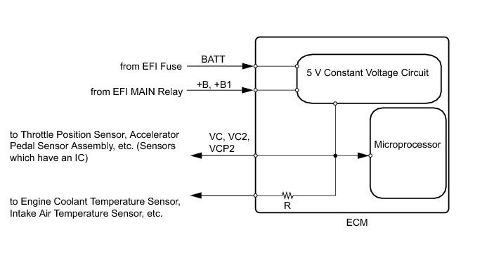 The ECM constantly uses 5 V from the battery voltages supplied to the +B (BATT) terminal to operate the microprocessor. The ECM also provides this power to the sensors through the VC output circuit.