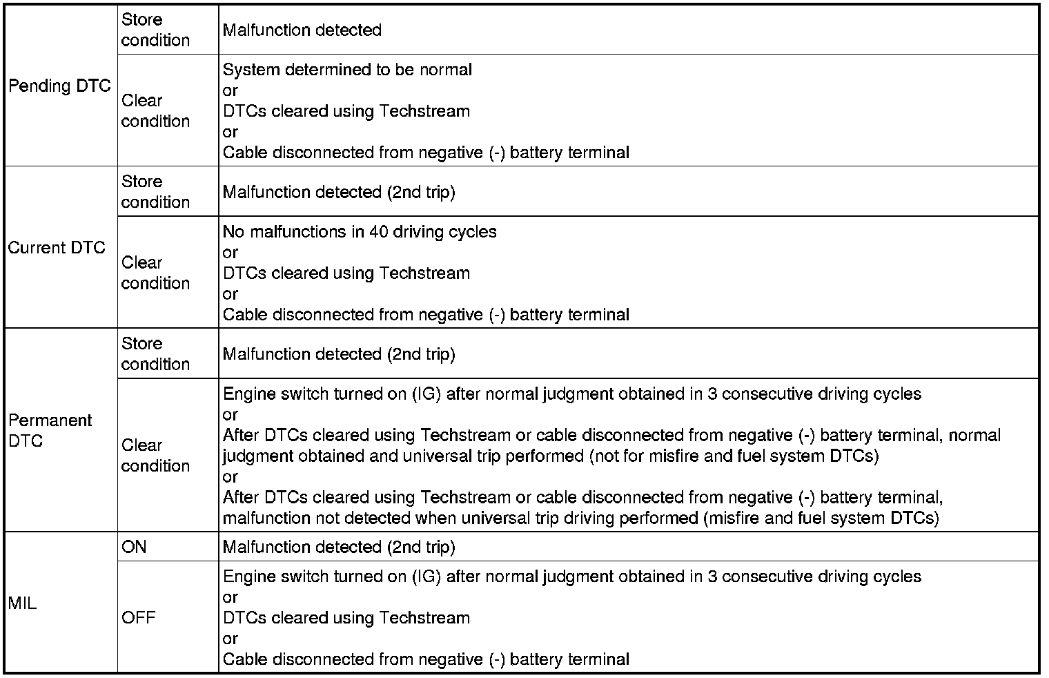 * Current and pending DTCs can be cleared by using the Techstream or by disconnecting the cable from the negative battery terminal. However, permanent DTCs cannot be cleared using either of these two methods.