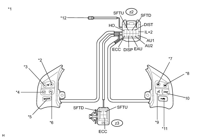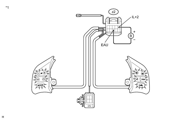 (1) Connect a positive (+) lead to terminal IL+2 and a negative (-) lead to terminal EAU of the steering pad switch assembly connector.