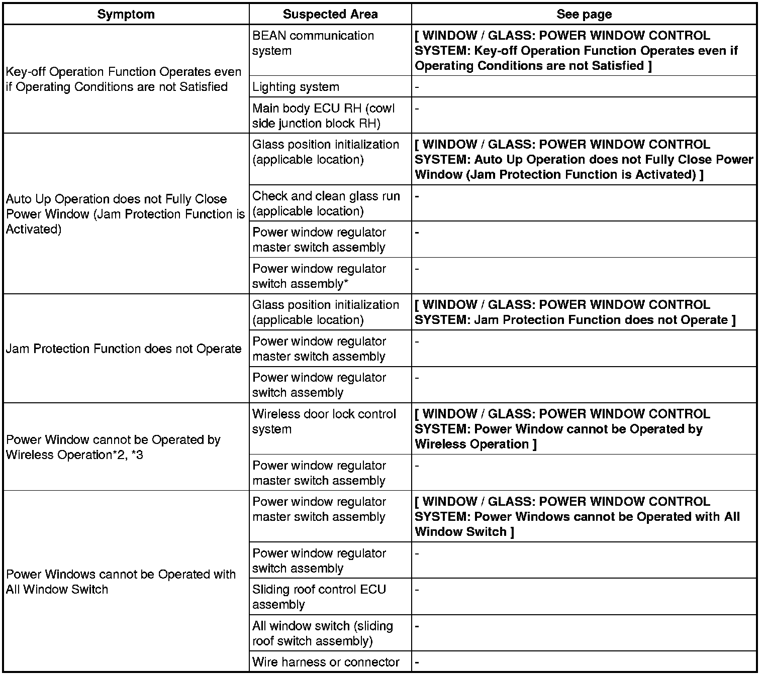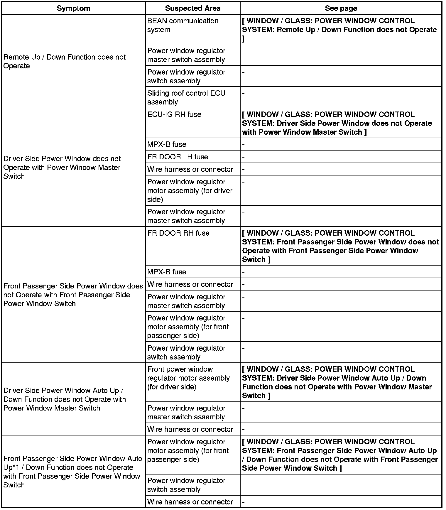 WINDOW / GLASS: POWER WINDOW CONTROL SYSTEM: PROBLEM SYMPTOMS TABLE