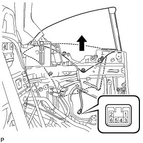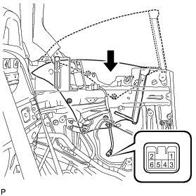 (f) Connect the cable to the negative (-) battery terminal and the power window regulator motor connector.