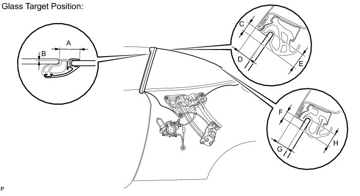 * Determine the fully closed position by referring to the measurements for areas C and E, and F and H in the Glass Target Position diagram.