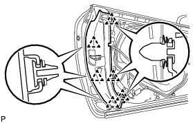 (b) Insert the rear end of the front door outside handle assembly into the front door outside handle frame then slide the front door outside handle assembly towards the front of the vehicle to install it.