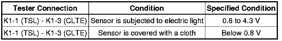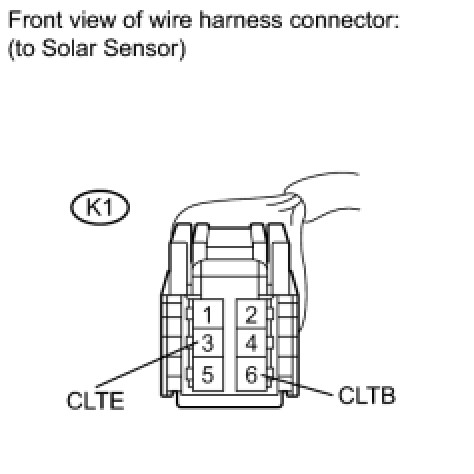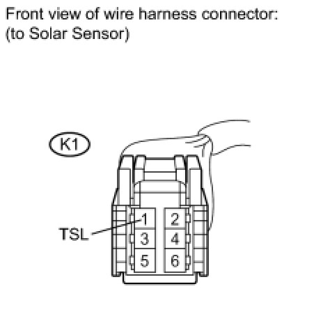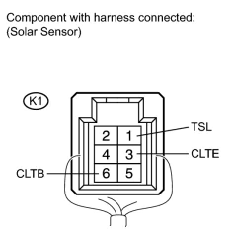 * The connection procedure for using a digital tester such as a TOYOTA electrical tester is shown above. When using an analog tester, connect the negative (-) lead to terminal 1 and positive (+) lead to terminal 6 of the solar sensor.