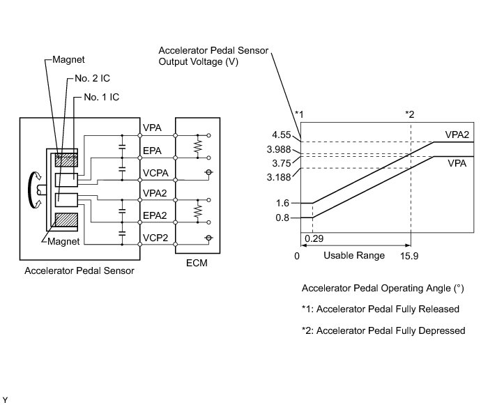 The accelerator pedal position sensor is mounted on the accelerator pedal bracket and has 2 sensor circuits: VPA (main) and VPA2 (sub). This sensor is a non-contact type, and uses Hall-effect elements, in order to yield accurate signals, even in extreme driving conditions, such as at high speeds as well as very low speeds. The voltage, which is applied to terminals VPA and VPA2 of the ECM, varies between 0 V and 5 V in proportion to the operating angle of the accelerator pedal (throttle valve). A signal from VPA indicates the actual accelerator pedal opening angle (throttle valve opening angle) and is used for engine control. A signal from VPA2 conveys the status of the VPA circuit and is used to check the accelerator pedal position sensor itself.