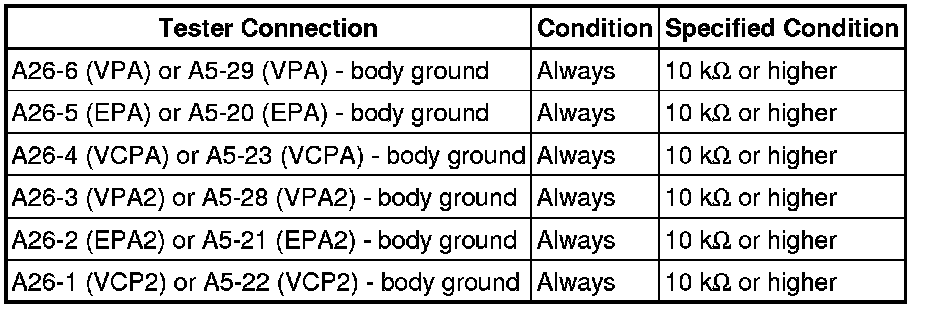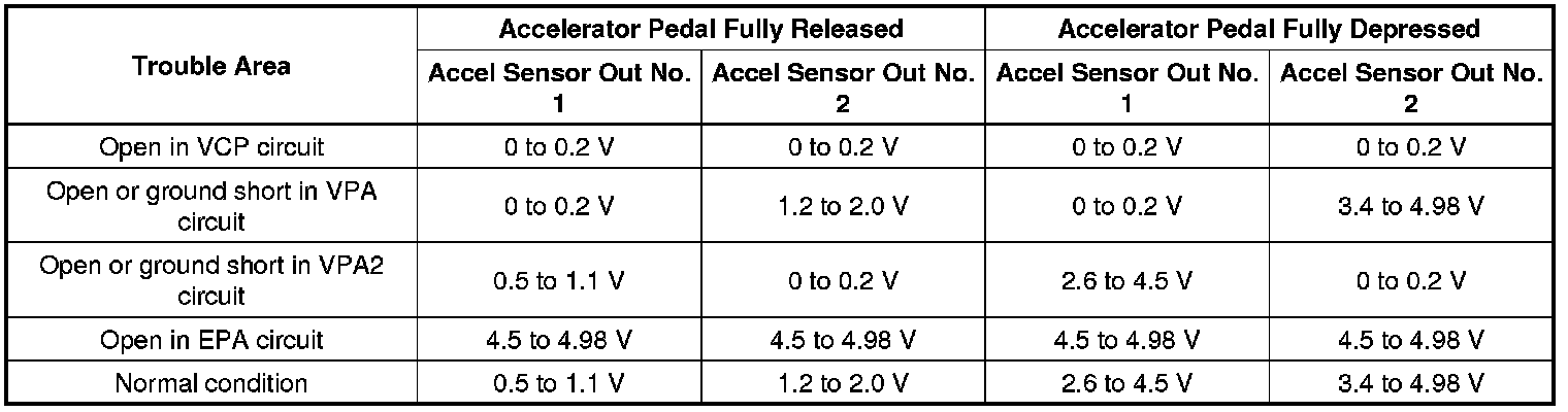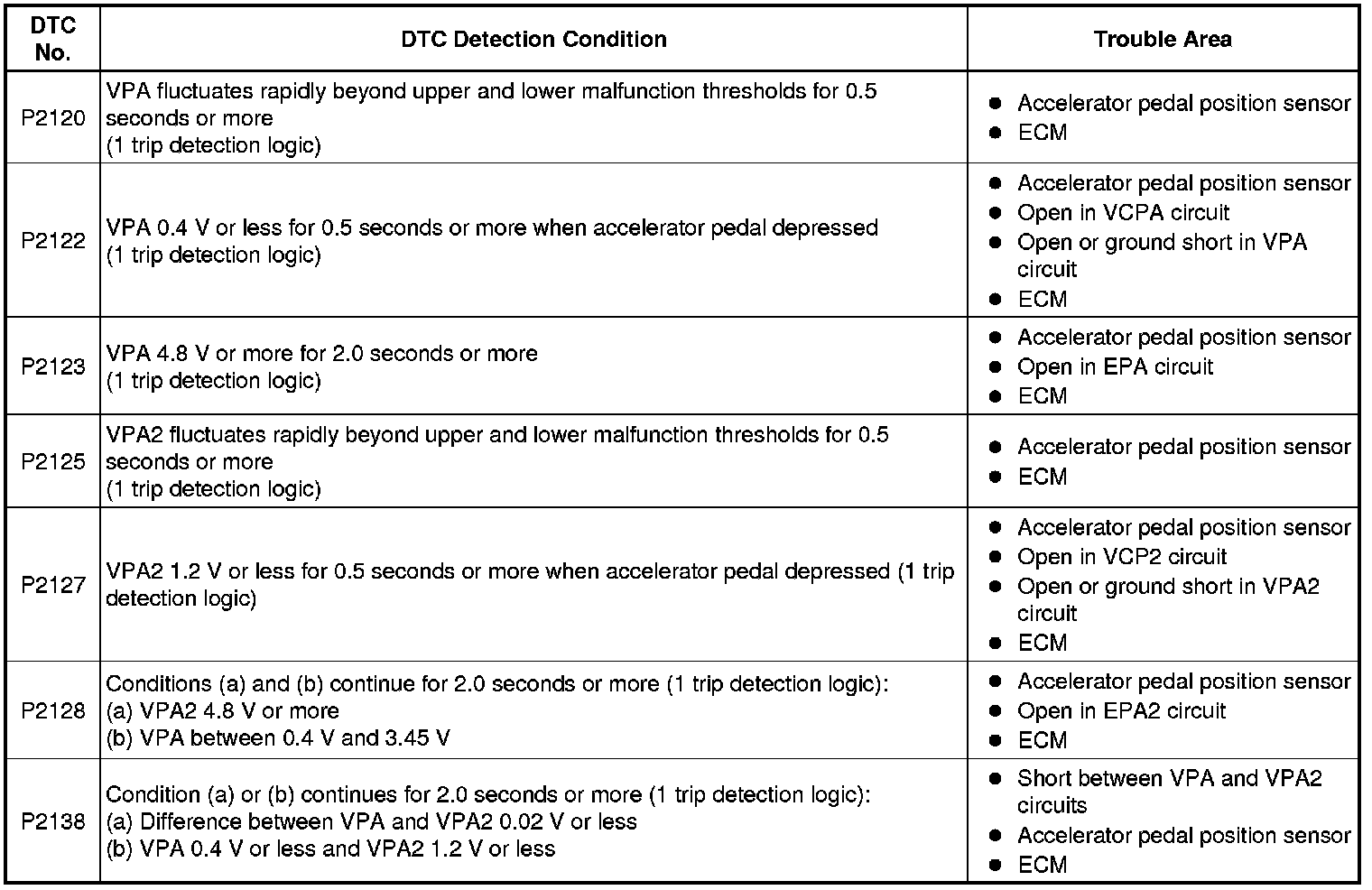When the output voltage of VPA is less than 0.4 V for more than 0.5 seconds when the accelerator pedal is fully depressed, DTC P2122 is stored.
