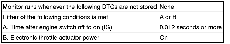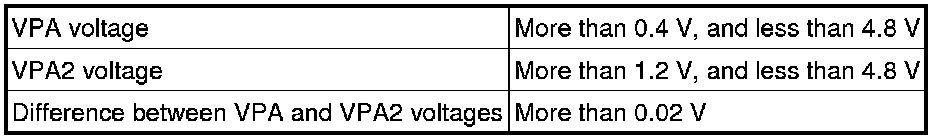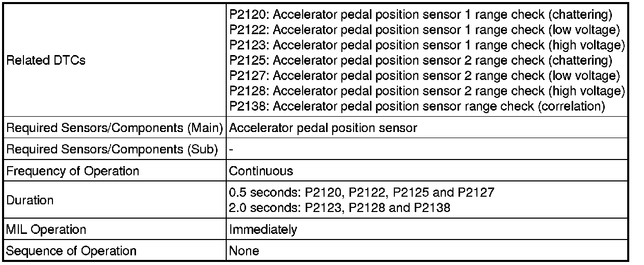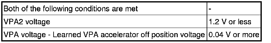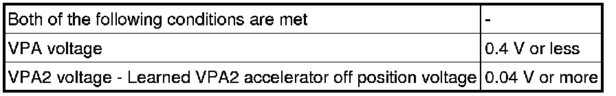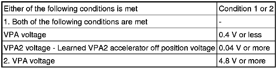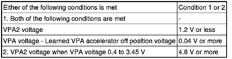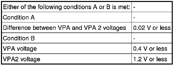When either output voltage of VPA or VPA2 deviates from the standard range, or the difference between the output voltages of the 2 sensor circuits is less than the threshold, the ECM determines that there is a malfunction in the accelerator pedal position sensor. The ECM then illuminates the MIL and stores a DTC.