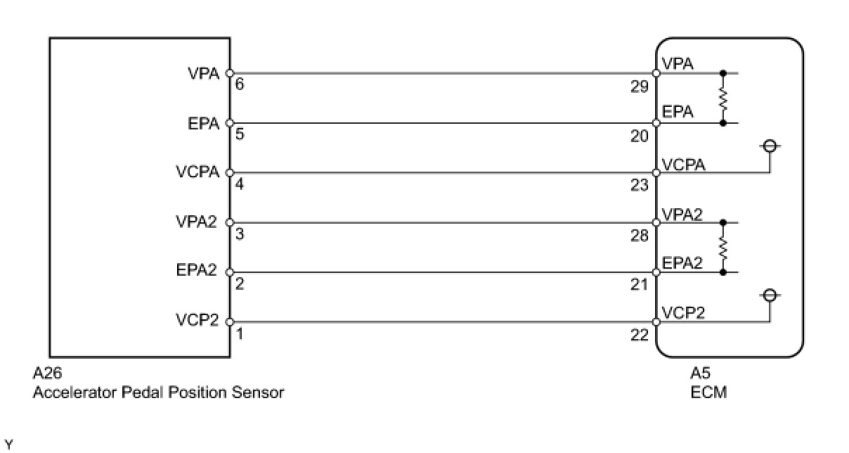 When any of DTCs P2120, P2121, P2122, P2123, P2125, P2127, P2128 and P2138 are set, the ECM enters fail-safe mode. If either of the 2 sensor circuits malfunctions, the ECM uses the remaining circuit to calculate the accelerator pedal position to allow the vehicle to continue driving. If both of the circuits malfunction, the ECM regards the accelerator pedal as being released. As a result, the throttle valve is closed and the engine idles.