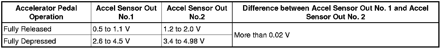 When any of these DTCs are set, check the accelerator pedal position sensor voltage by entering the following menus: Powertrain / Engine / Data List / All Data / Accel Sensor Out No.1 and Accel Sensor Out No.2.