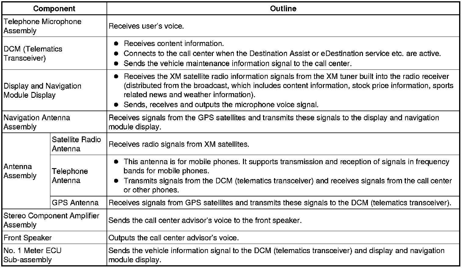 * LEXUS ENFORM consists mainly of a telephone microphone assembly, DCM (telematics transceiver), display and navigation module display, and telephone and GPS antenna.