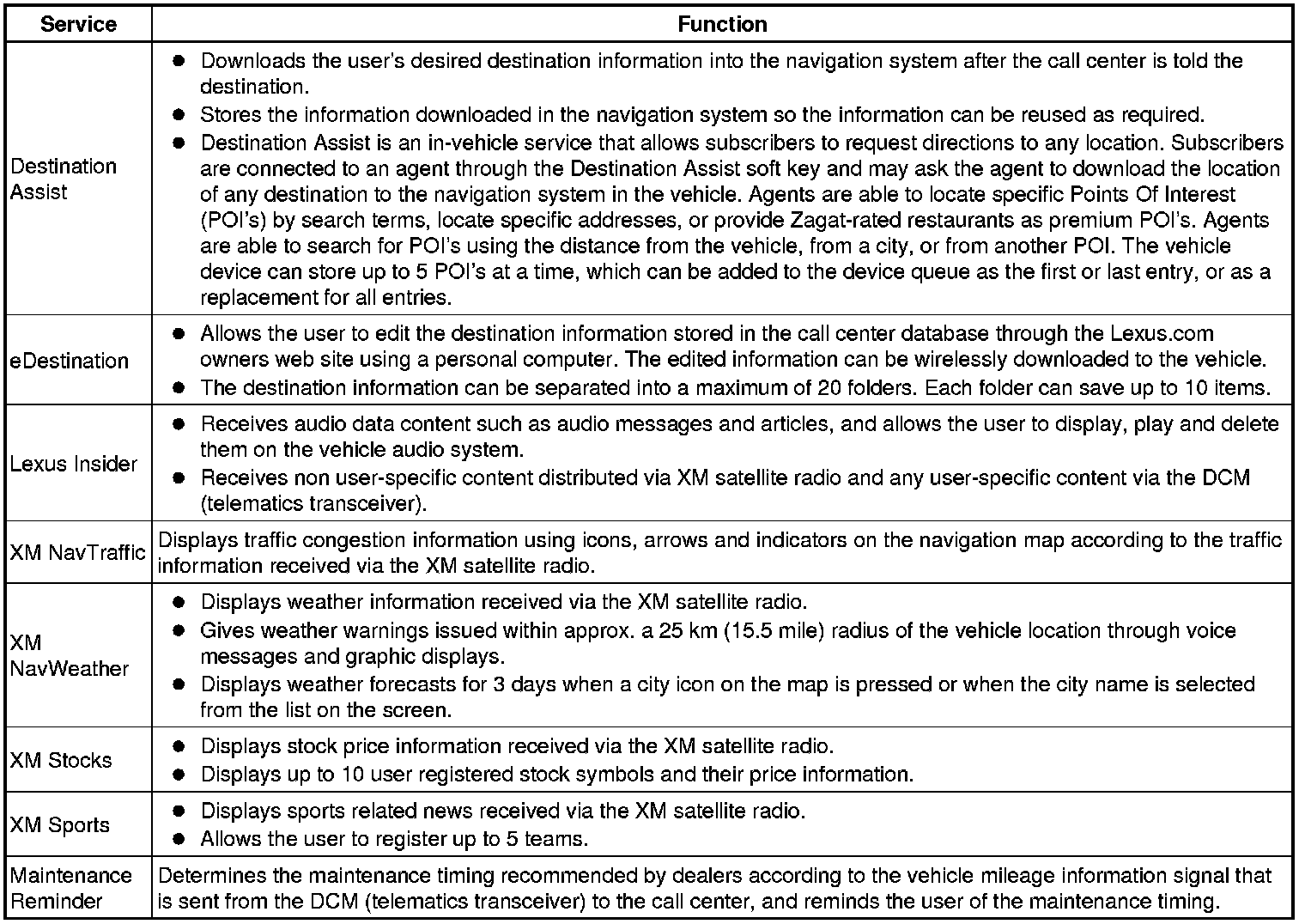 * LEXUS ENFORM provides the following services: Destination Assist, eDestination, Lexus Insider, XM NavTraffic, XM NavWeather, XM Stocks, XM Sports, Maintenance Reminder, Voice Command, and Safety Connect. For details about Safety Connect, refer to Safety Connect System System Description.