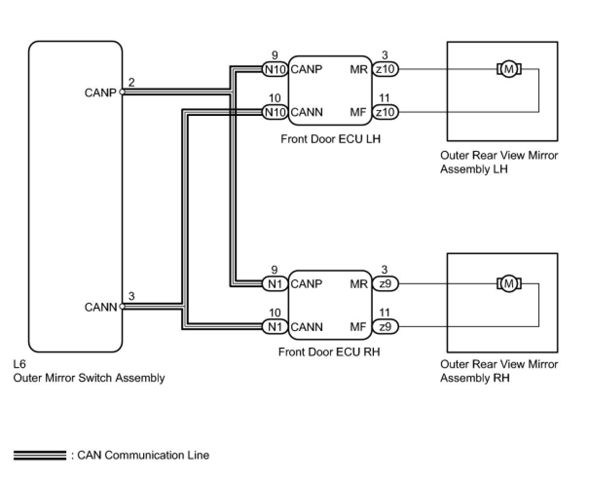 The outer mirror switch sends information about the operating condition of the mirror retract switch (switch input signals) through the CAN (can communication) line. Then the switch input signals are sent to the front door ECU LH and RH.