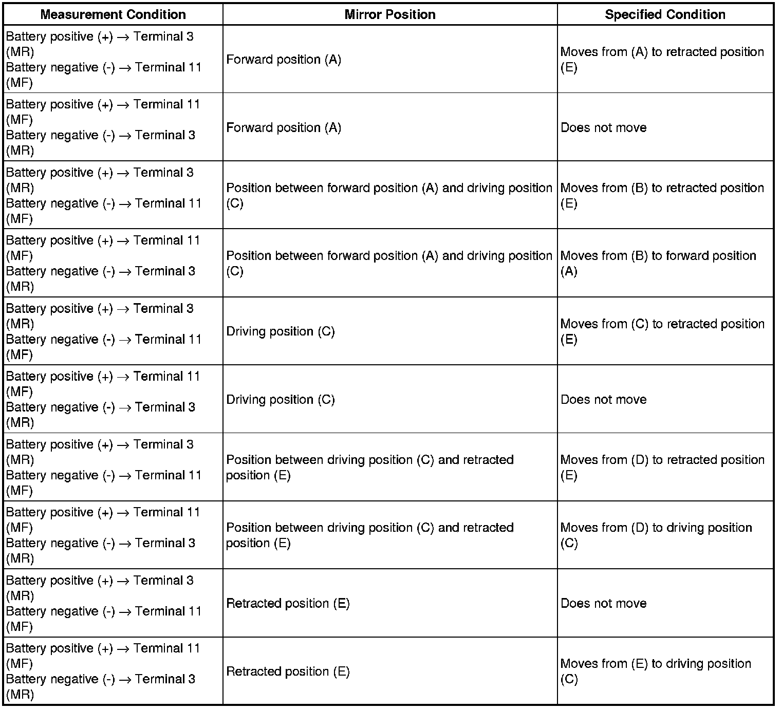 (b) For each mirror position: Disconnect the battery, set the mirror position by hand, connect the battery, and check the retractable mirror's movement.