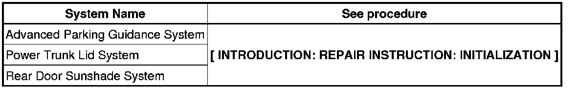 When disconnecting the cable from the negative (-) battery terminal, initialize the following systems after the cable is reconnected.
