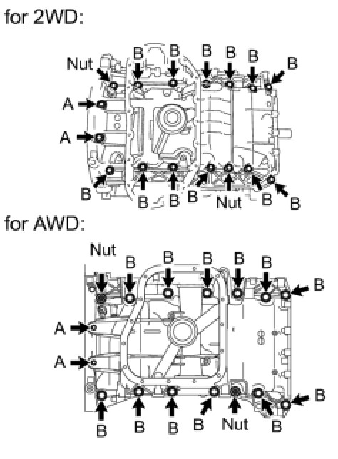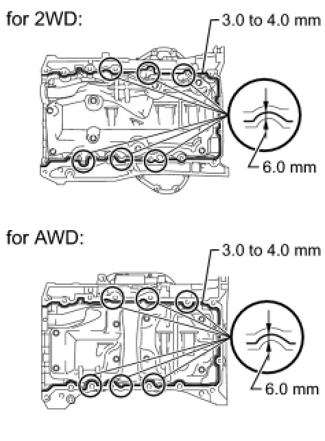 * Install the oil pan within 3 minutes and tighten the bolts and nuts within 10 minutes after applying seal packing.
