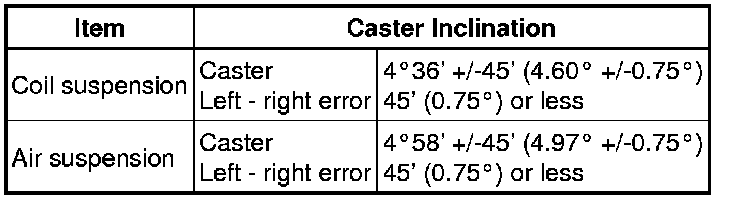 If the caster and steering axis inclinations are not within the specified values, after the camber has been correctly adjusted, recheck the suspension parts for damaged and/or worn out parts.
