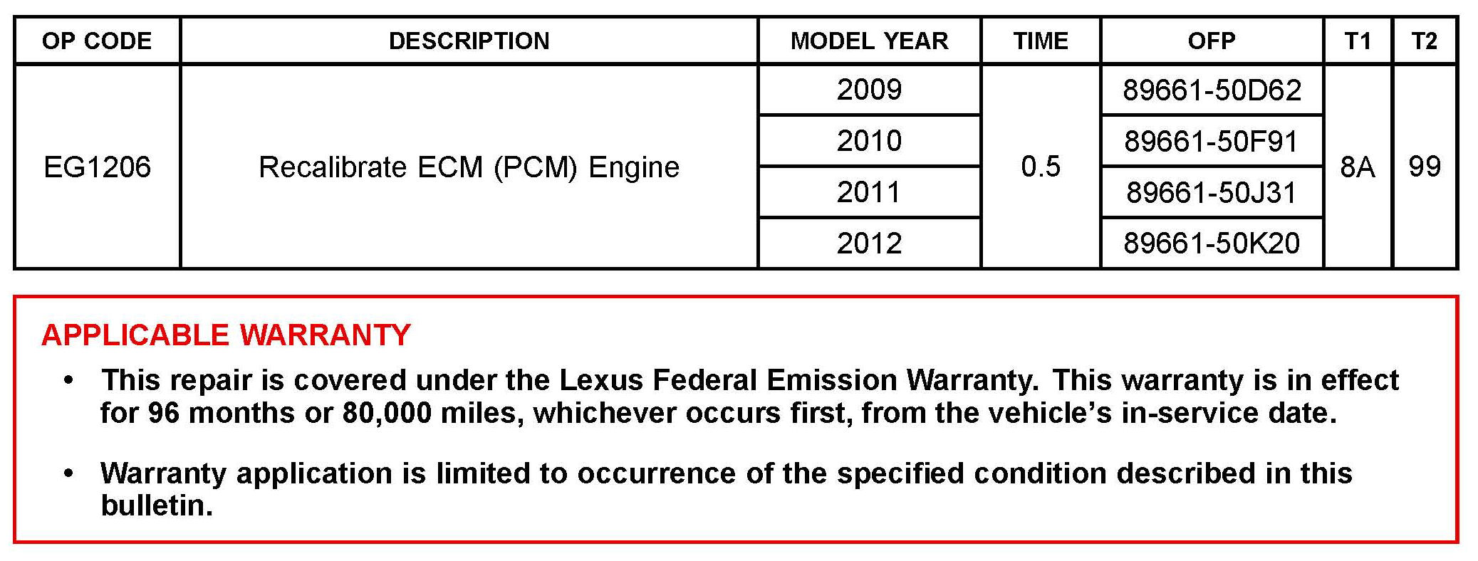 Some 2009 - 2012 model year LS 460 vehicles equipped with 4WD may exhibit a vibration or shudder feeling between 30 - 75 mph (48 - 121 km/h). The Engine Control Module (ECM) (SAE term: Powertrain Control Module/PCM) logic has been revised to address this condition. Follow the procedure in this bulletin to determine if recalibration of the ECM (PCM) is required.