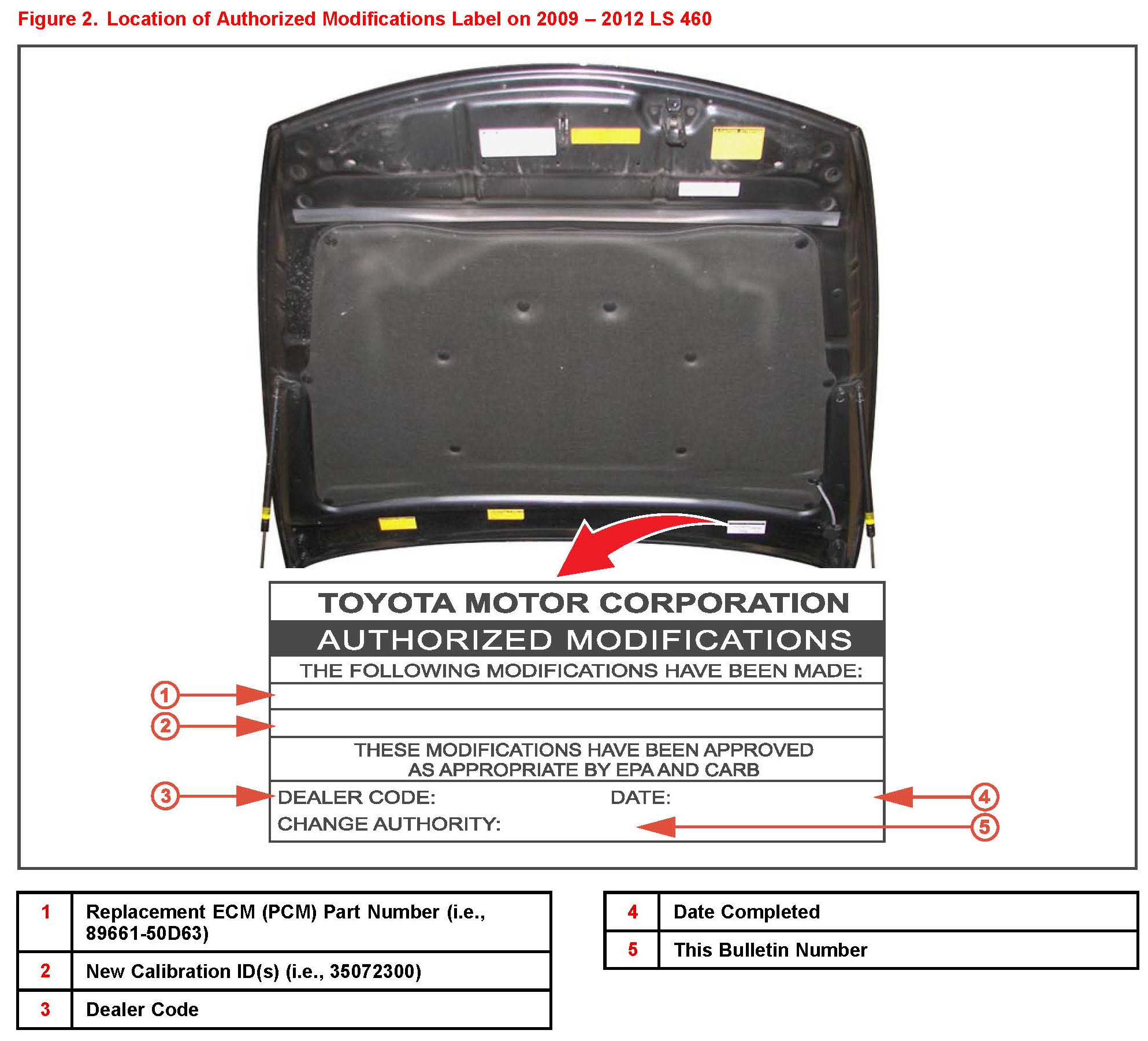 4. Check for the Authorized Modifications Label affixed to the vehicle in the location shown in Figure 2. Confirm if the ECM (PCM) calibration has been updated. If the calibration ID listed is NOT the latest ECM (PCM) calibration - go to step 5.