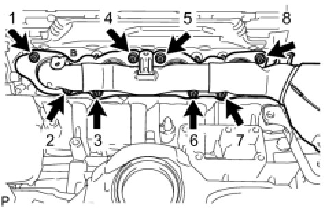Install the exhaust manifold with the new nuts by uniformly tightening the nuts in several steps, in the sequence shown in the illustration.