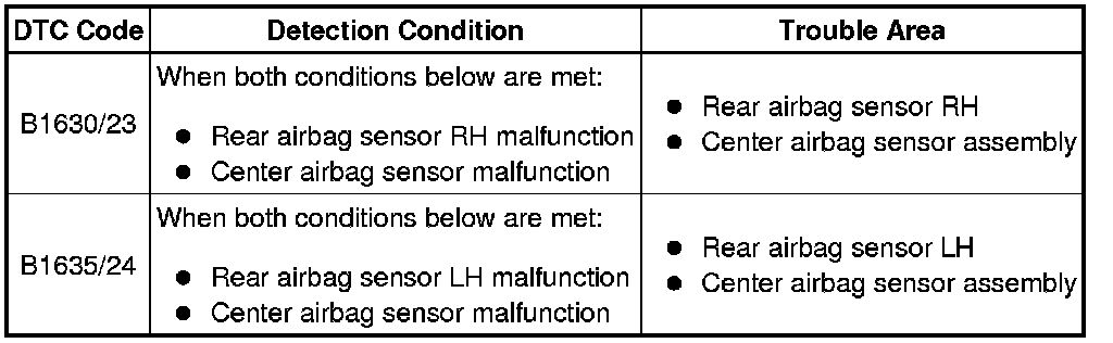DTC B1630/23 or B1635/24 is recorded when a malfunction is detected in the rear airbag sensor LH or RH circuit.