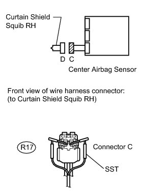 Never connect the tester to the curtain shield airbag RH (curtain shield squib RH) for measurement, as this may lead to a serious injury due to airbag deployment.