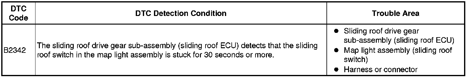 This DTC is stored when the sliding roof drive gear sub-assembly detects that the slide open switch, slide close switch, tilt up switch, or tilt down switch in the map light assembly is stuck for 30 seconds or more.