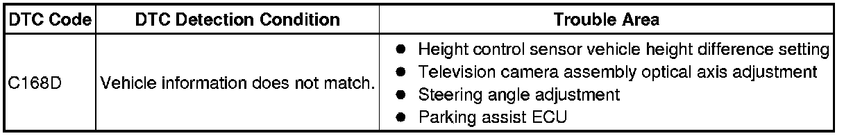 - If DTC C168D is still output after performing the television camera optical axis adjustment and steering angle setting 3 times, replace the parking assist ECU.