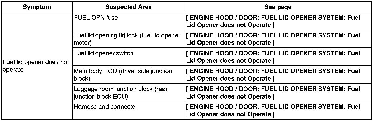 ENGINE HOOD / DOOR: FUEL LID OPENER SYSTEM: PROBLEM SYMPTOMS TABLE