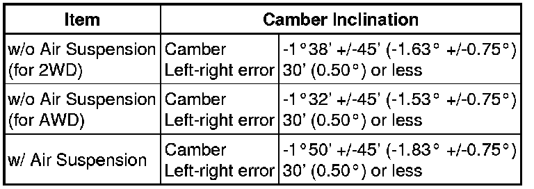 * If the measured value is not within the specified range, inspect the suspension parts for damage and wear. Replace parts as necessary because camber cannot be properly adjusted with any damaged or worn parts.
