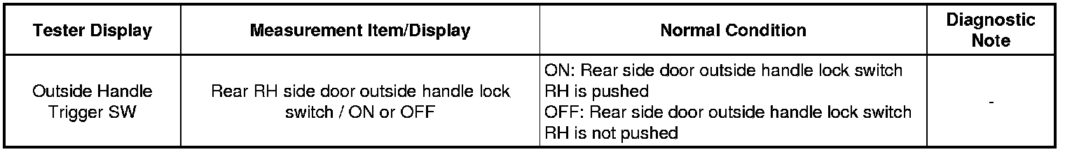 If the rear door RH entry lock function does not operate but the entry unlock operation operates, the communication line between the vehicle and electrical key transmitter is normal. Either of the following may have occurred: 1) the entry lock switch is malfunctioning; or 2) the rear door ECU RH receives the entry lock switch ON signal, but is unable to send the signal to the certification ECU through CAN communication.