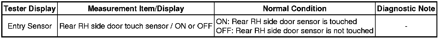 If the rear right door entry unlock function does not operate but the entry lock operation operates, the communication line between the vehicle and electrical key transmitter is normal. Either of the following may have occurred: 1) the door outside handle touch sensor is malfunctioning; or 2) the rear door ECU RH receives the door outside handle touch sensor ON signal, but is unable to send the signal to the certification ECU through CAN communication.