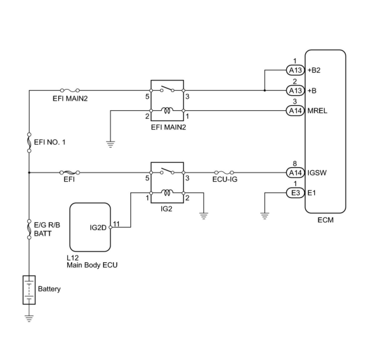When the power switch is turned on (IG), the battery voltage is applied to terminal IGSW of the ECM. The ECM MREL output signal causes a current to flow to the coil, closing the contacts of the EFI relay (EFI MAIN2) and supplying power to terminal +B and +B2 of the ECM.