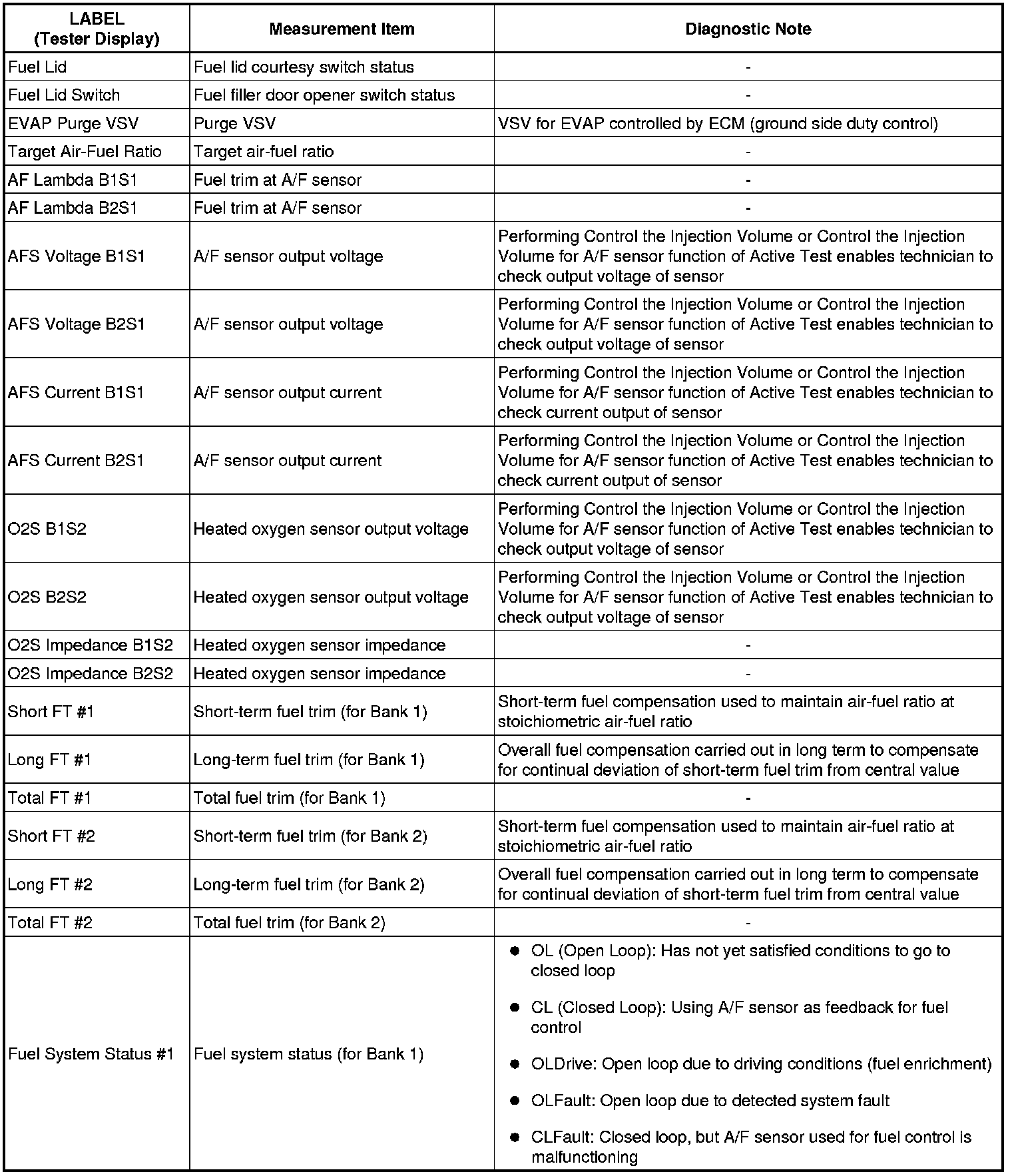 * The ECM records vehicle and driving condition information as freeze frame data the moment a DTC is stored. When troubleshooting, freeze frame data can be helpful in determining whether the vehicle was moving or stationary, whether the engine was warmed up or not, whether the air-fuel ratio was lean or rich, as well as other data recorded at the time of a malfunction.