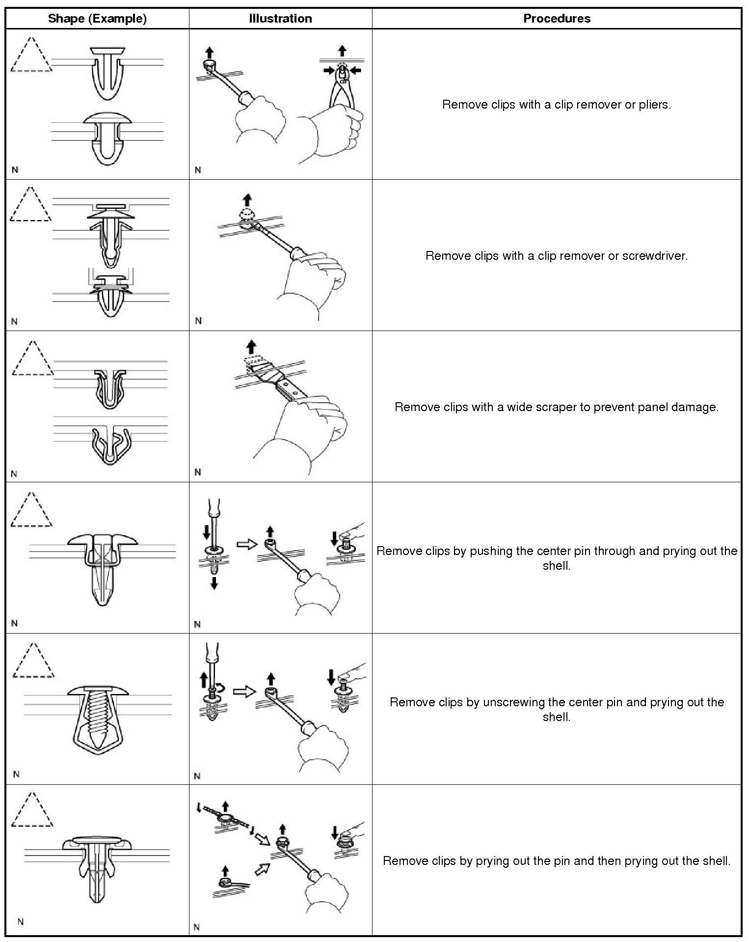 (2) The removal and installation methods of typical clips used for vehicle body parts are shown in the table below.