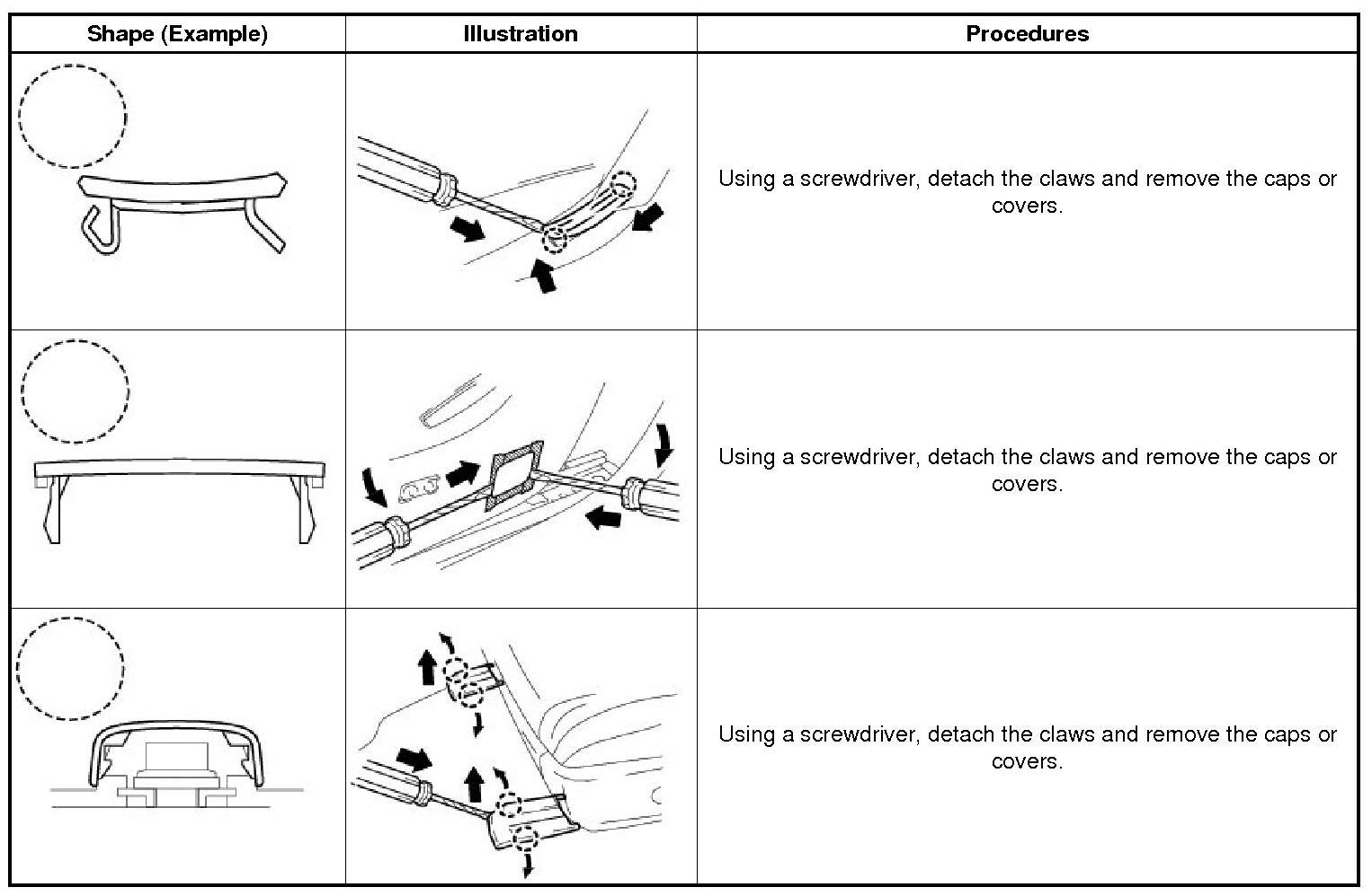 (2) The removal and installation methods of typical claws used for vehicle body parts are shown in the table below.