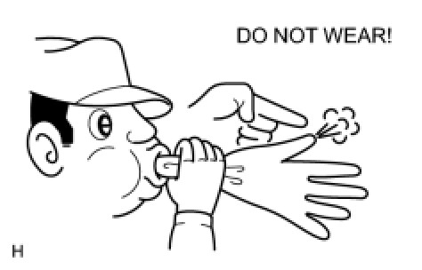 (c) Before inspecting the high-voltage system or disconnecting the low voltage connector of the inverter with converter assembly, take safety precautions such as wearing insulated gloves and removing the service plug grip to prevent electrical shocks. After removing the service plug grip, put it in your pocket to prevent other technicians from accidentally reconnecting it while you are working on the high-voltage system.