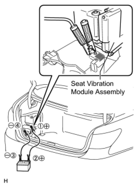 Do not allow the booster cable to contact the seat vibration module assembly. The positive (+) terminal side of the auxiliary battery is close to the seat vibration module assembly. When charging the battery, it is extremely dangerous if the booster cable contacts the seat vibration module assembly, as sparks occur and the seat vibration module assembly may be damaged.