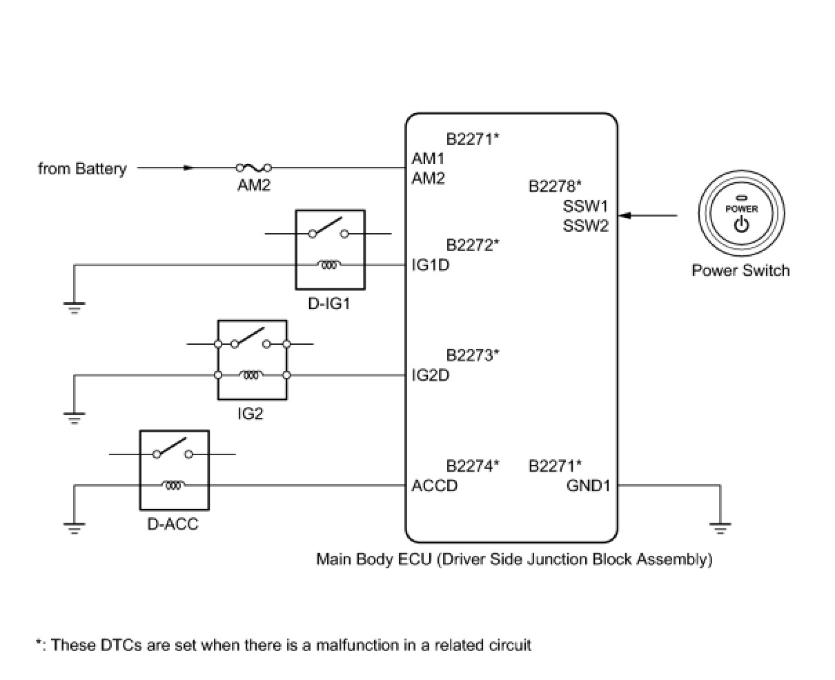 When one of the DTCs shown in the illustration below is detected, troubleshoot the DTC(s) by following the troubleshooting procedure relevant to the DTC(s). If the power source mode still cannot be changed normally, despite troubleshooting, one of the following may have occurred: