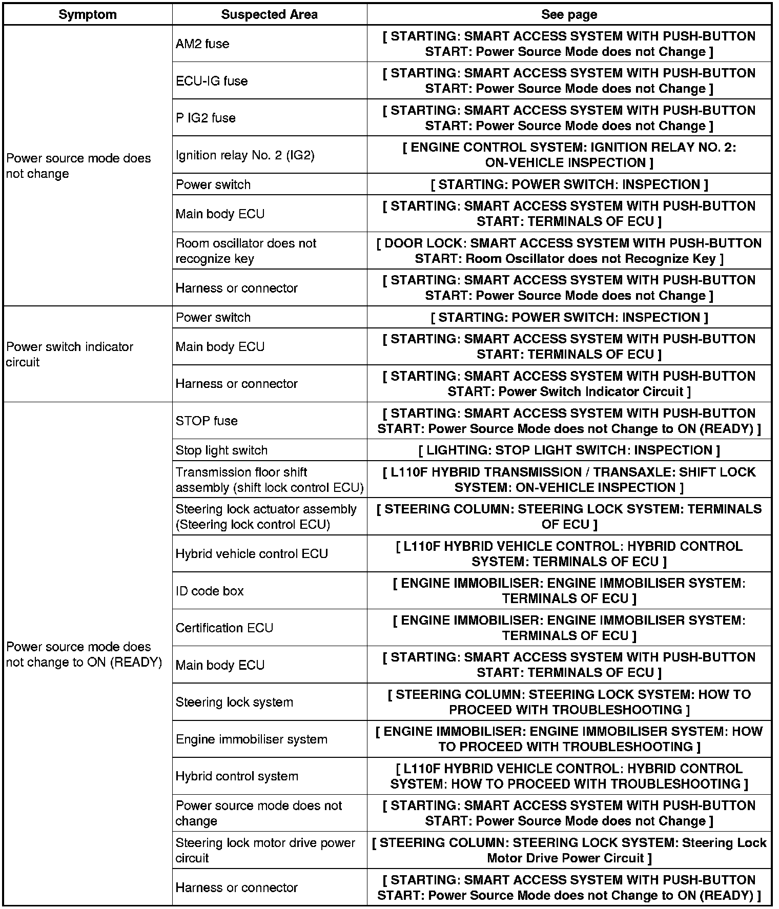 2UR-FSE STARTING: SMART ACCESS SYSTEM WITH PUSH-BUTTON START: PROBLEM SYMPTOMS TABLE