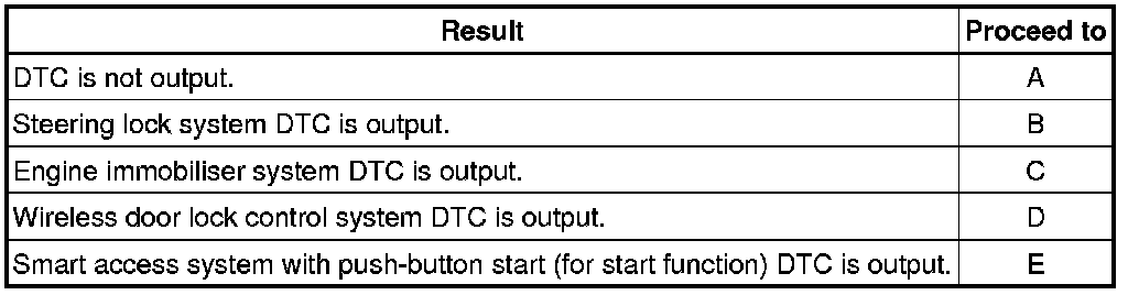 (c) Recheck for DTCs. Based on the DTCs output, try to cause the same steering lock system DTC, engine immobiliser system DTC, wireless door lock control system DTC or smart access system with push-button start (for start function) DTC to be output by simulating the symptoms indicated by the DTCs.