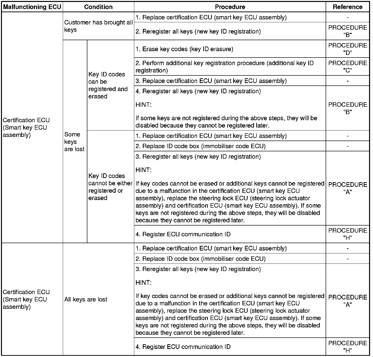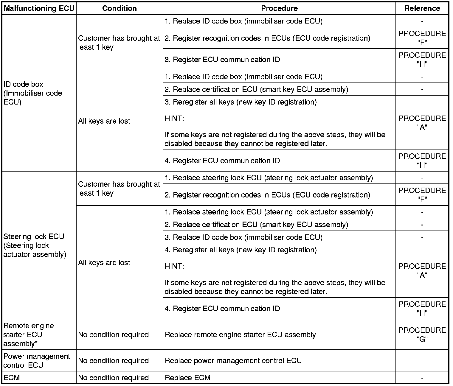 (a) The following table shows ECU replacement and key registration procedures for cases in which a malfunctioning ECU has been identified through the troubleshooting of the smart access system with push-button start.
