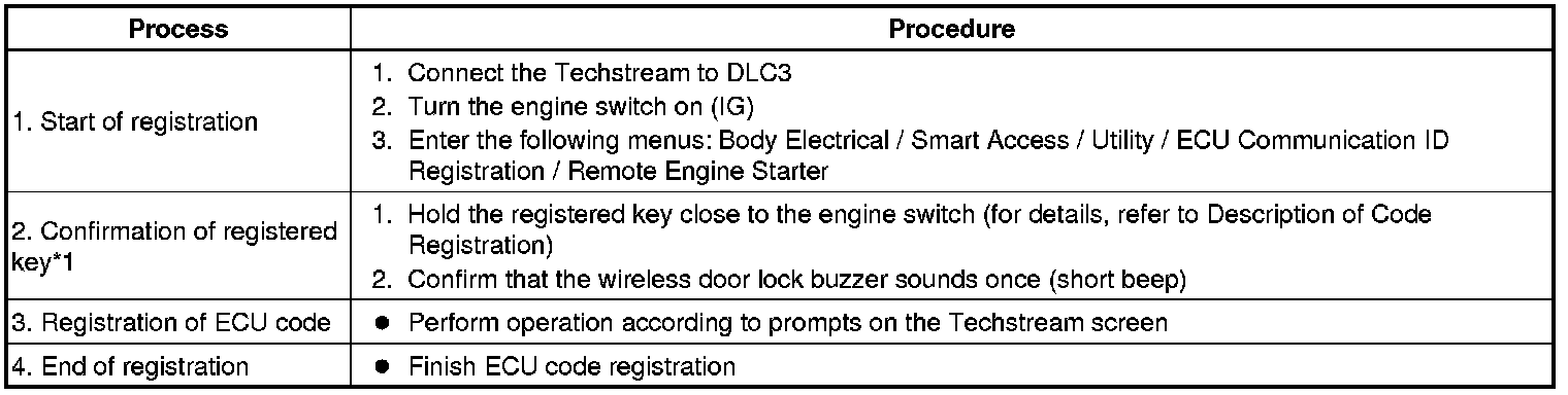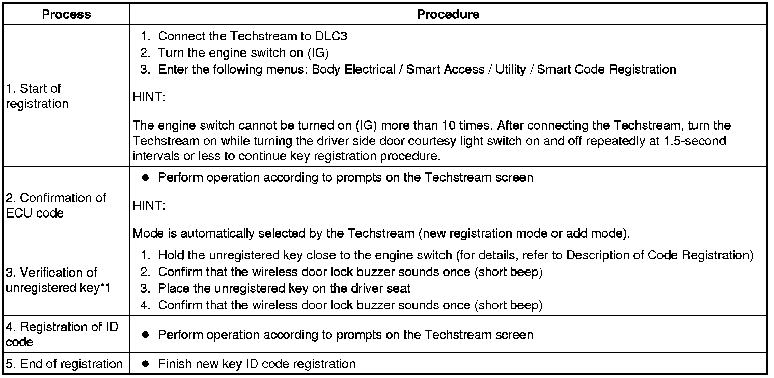 * *1: Perform this process for one of the keys which are to be registered for the vehicle. Finish the procedure within 30 seconds. If the procedure has not been finished within the specified time, perform the registration procedures again from process 1.