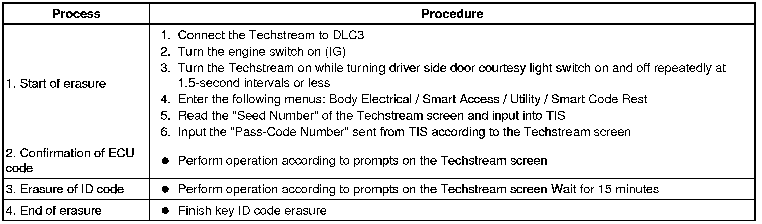 * *1: Perform this process for one of the keys which are to be registered for the vehicle. Finish the procedure within 30 seconds. If the procedure has not been finished within the specified time, perform the erasure procedures again from process 1.