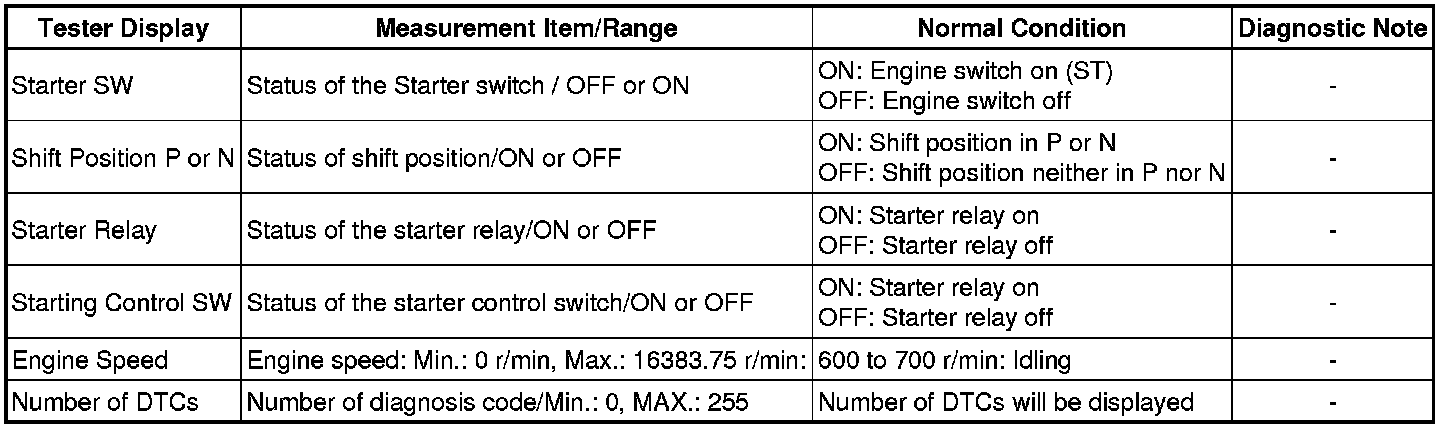 Using the Techstream to read the Data List allows the values or states of switches, sensors, actuators and other items to be read without removing any parts. This non-intrusive inspection can be very useful because intermittent conditions or signals may be discovered before parts or wiring is disturbed. Reading the Data List information early in troubleshooting is one way to save diagnostic time.