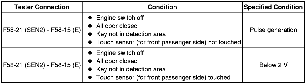 If the front passenger door entry lock function operates normally, but its entry unlock function does not, this means that the request code from the front passenger door is being output normally. In this case, a malfunction in the touch sensor circuit (from the certification ECU (smart key ECU assembly) to the front door outside handle assembly (touch sensor)) is suspected.