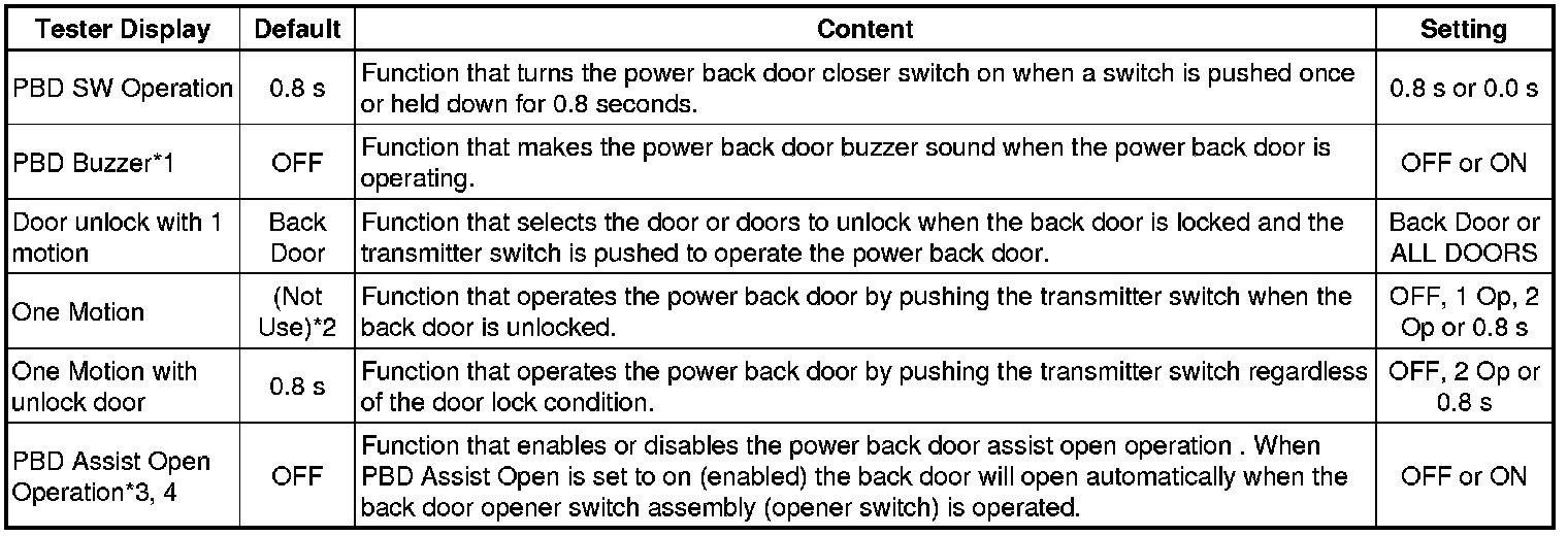 * *3: The power back door assist operation will be linked with the "Back Door Opening Operation" setting of the smart access system with push-button start (for entry function) only when all doors are locked. If "Back Door Opening Operation" is set to "OFF", the power back door assist will not operate even if "PBD Assist Open Operation" is set to "ON" Smart Access System With Push-Button Start (For Entry Function).