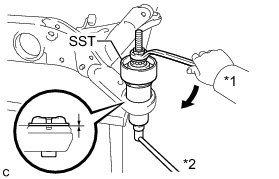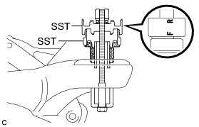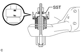 (c) Using SST, install the rear suspension member front body mounting cushion (LH Side) until there is no clearance between the rear suspension member sub-assembly and the rear suspension member front body mounting cushion (LH Side).