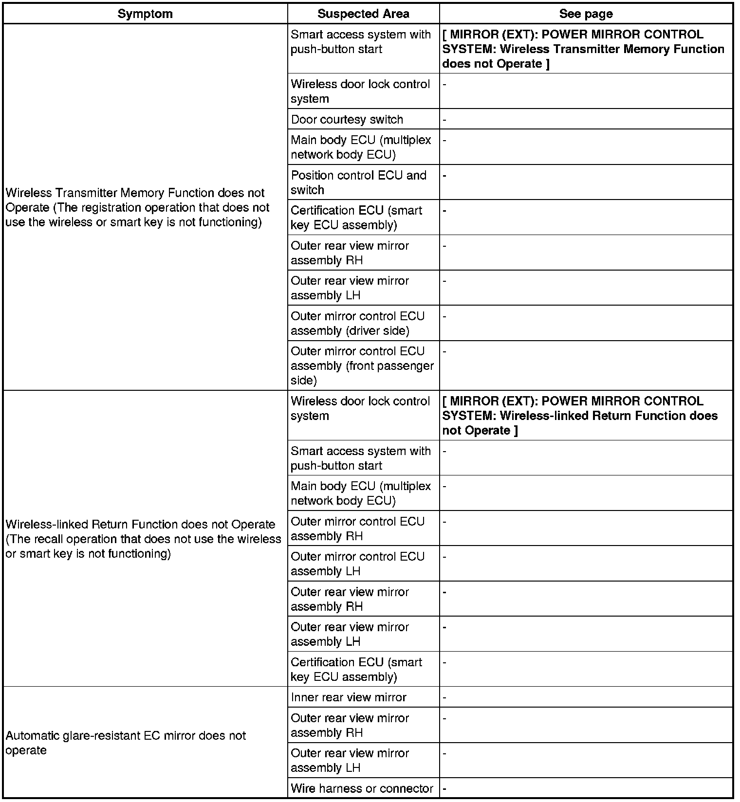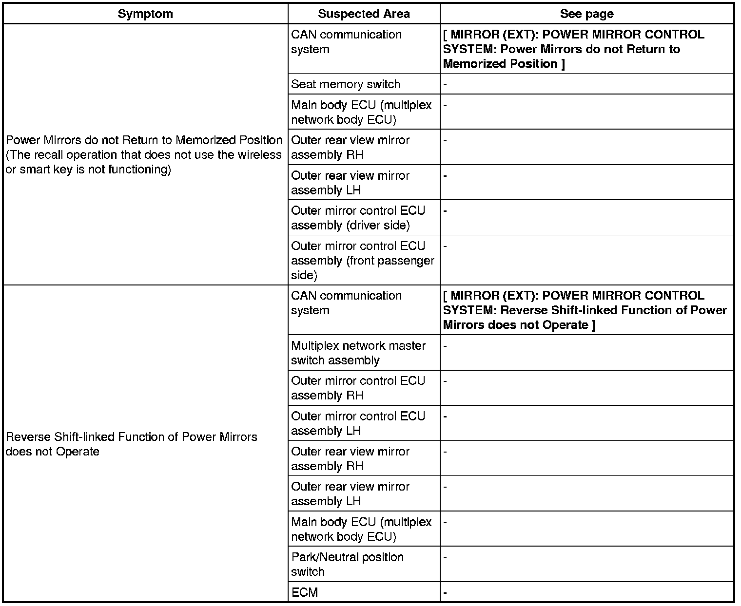 MIRROR (EXT): POWER MIRROR CONTROL SYSTEM: PROBLEM SYMPTOMS TABLE